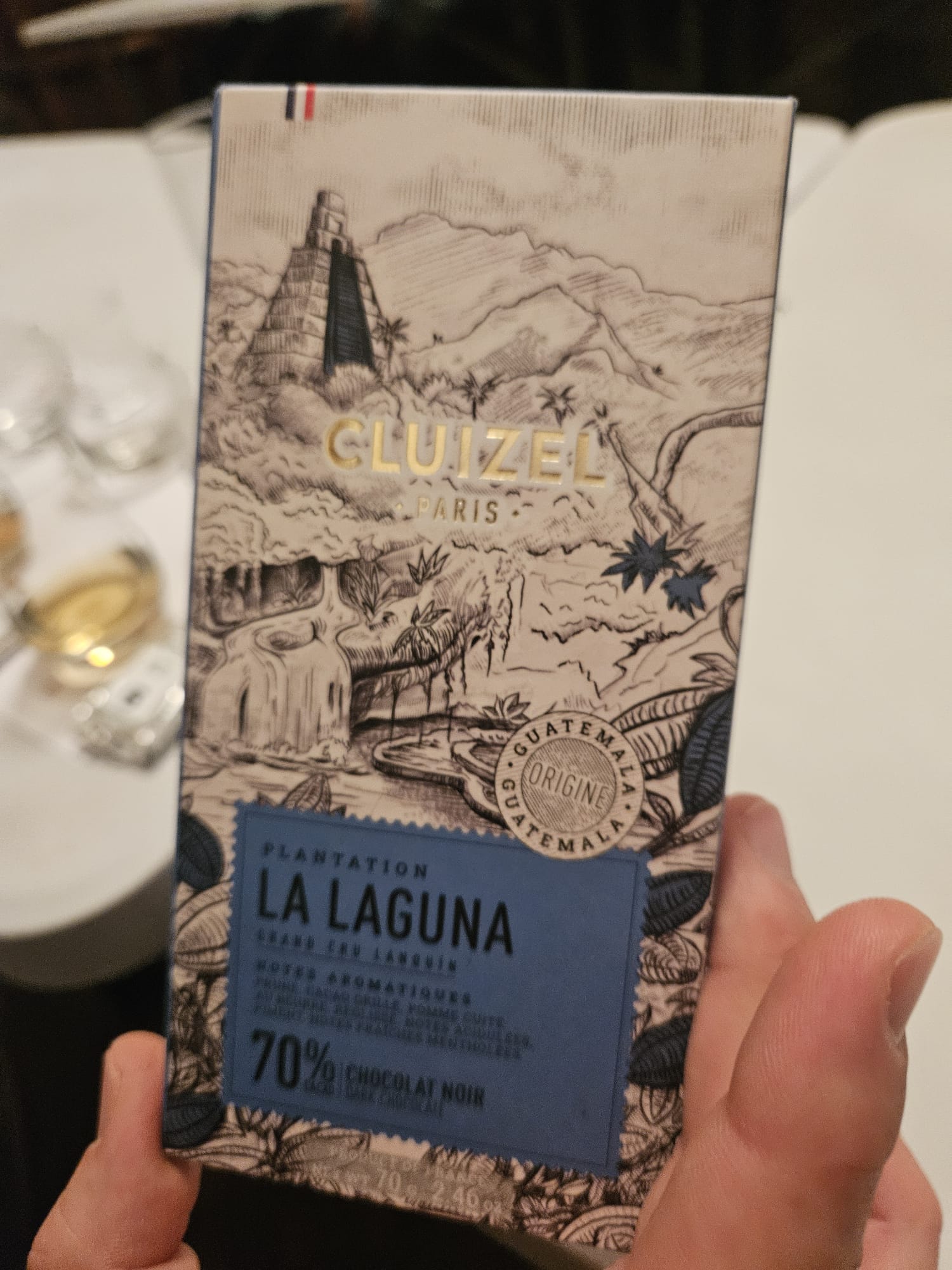 The chocolate bar came from Michel Cluizel, one of France’s most meticulous chocolate houses, sourced from small farms in Guatemala’s Alta Verapaz region, a mix of Trinitario and Criollo varieties. It’s fermented in wooden boxes, sun-dried, and roasted gently to preserve its natural balance. The result is a chocolate that feels carefully built rather than engineered – layers of roasted cocoa, molasses, plum and baked apple, lifted by licorice spice and a clean, lingering finish. Smooth, composed, and quietly confident.