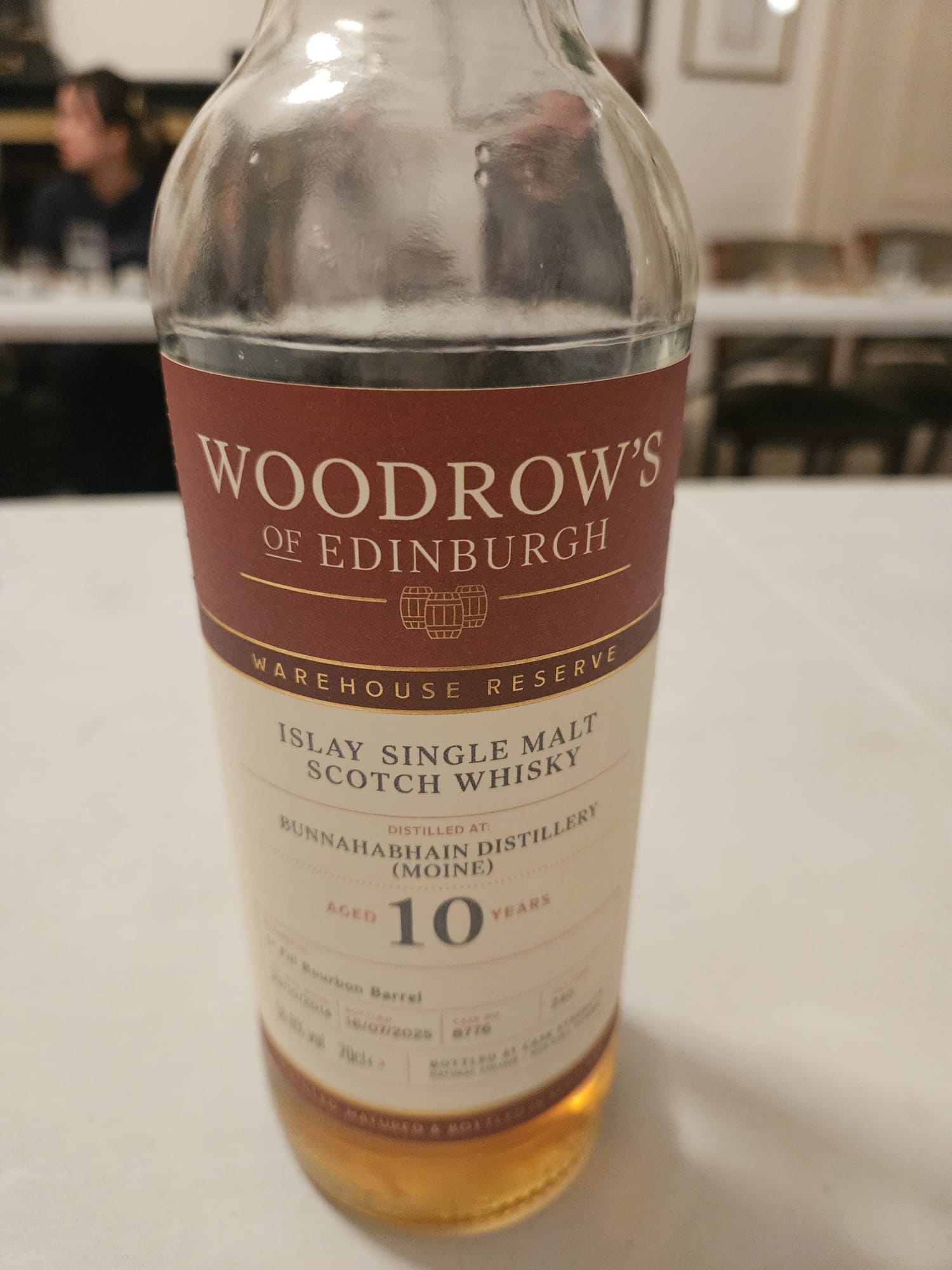 We’ve had great whisky from Woodrow’s of Edinburgh, and having said that Bunnahabhain is mostly famous for its unpeated whisky, we poured one of their releases of the peaty variety. Bunnahabhain uses “Mòine” to denote peated whisky to reference the distillery’s 19th-century origins when its malts were strongly peated, and to signify the smoky, peaty character of this specific line. “Mòine” means “peat” in Scots Gaelic, directly indicating the presence of this smoky flavor profile.